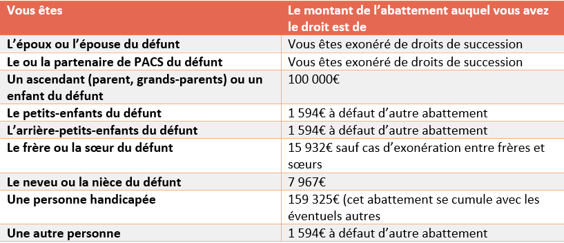 Abattement sur les droits de succession : Avant de la soumettre à un barème progressif d’imposition, l’administration fiscale prélèvera des impôts sur la part de votre succession. Le montant de cet abattement dépend de votre lien de parenté avec le défunt.