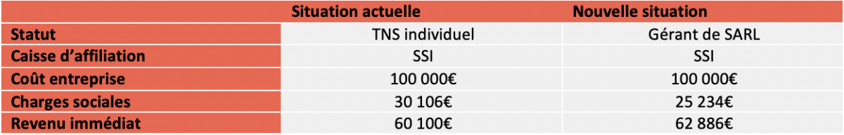 Il y a des astuces afin que vous mainteniez votre rémunération en faisant diminuer vos charges sociales. Prenons un exemple, sur une base de 100 000 € annuel.